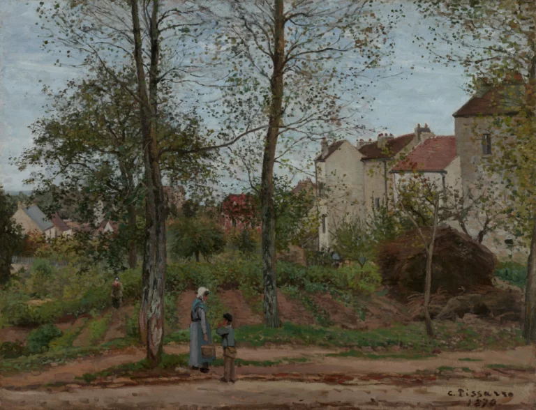 In the foreground, a woman pauses, bucket in hand. She speaks to a young boy, satchel slung over his shoulder. Behind them, the trees are shedding their leaves. The grey sky settles gently over the red rooftops. Look closely at the brushwork: each stroke follows its own logic. Pissarro turns the canvas into a field of living textures.