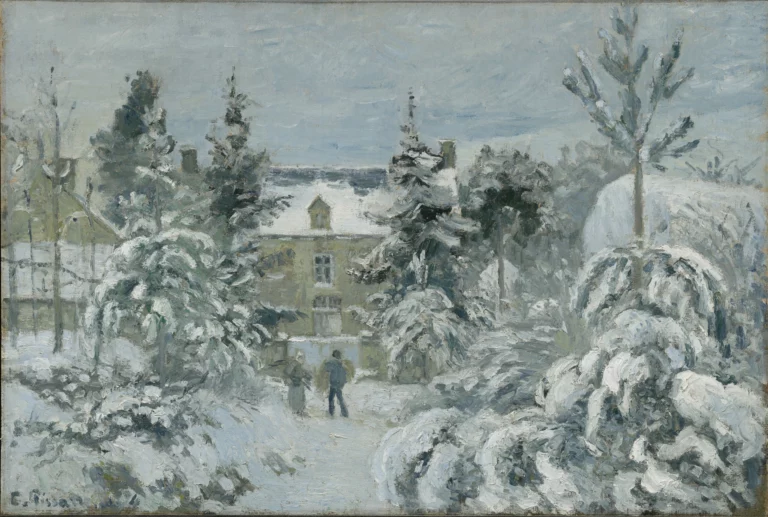 Observe this masterful composition: the snow-covered roofs align behind frosted trees. Pissarro uses a restrained palette of bluish greys, whites, and muted ochres. The pictorial matter reveals his speed of execution: thick, energetic brushstrokes leave the raw canvas visible in places. This alla prima technique conveys the painter’s urgency facing the elements. Generous impasto sculpts the snow piled on the conifers. Two dark silhouettes animate the center of the canvas, tiny against the winter landscape.