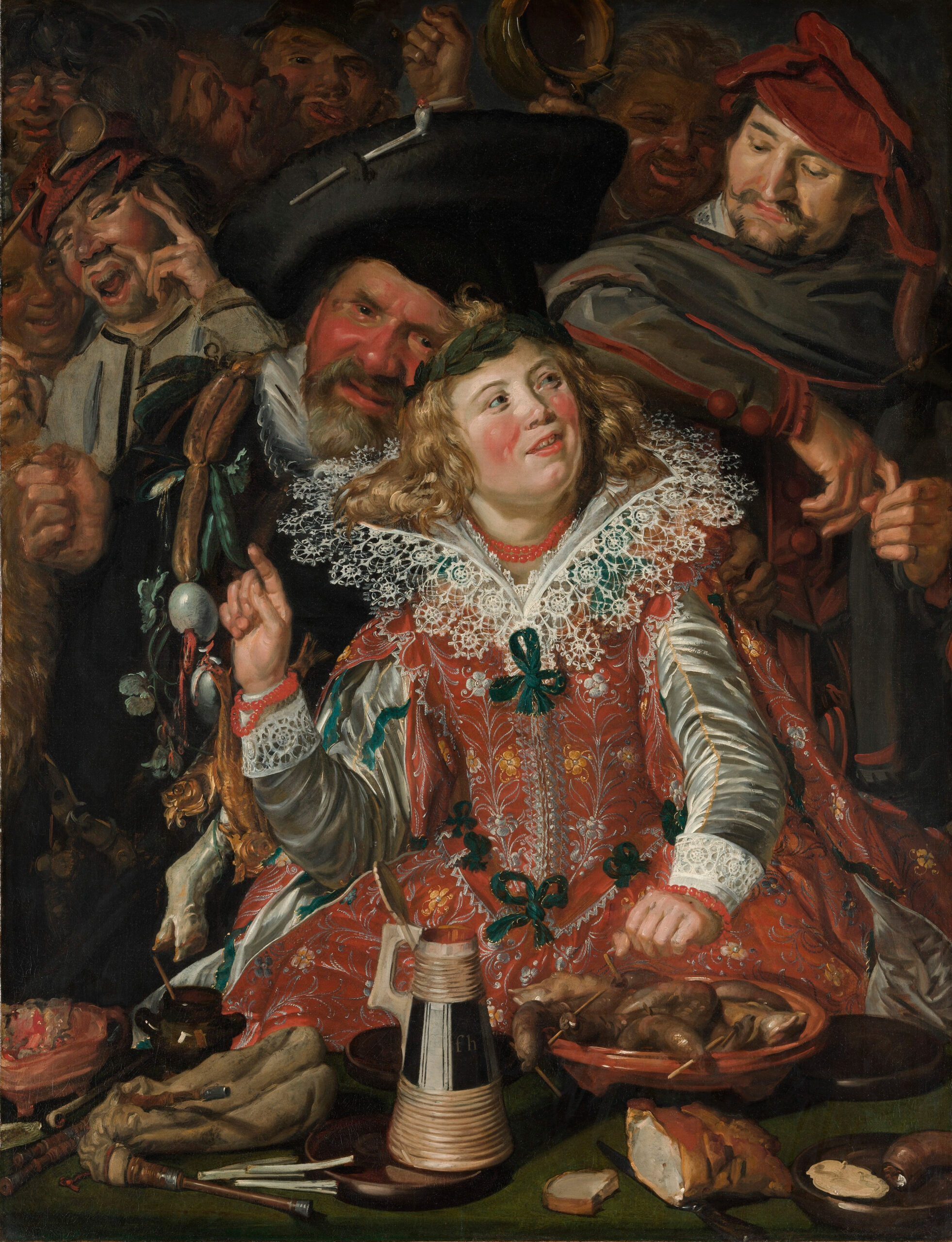 At the center of the composition stands a man dressed as a woman, adorned in a sumptuous embroidered red dress and lace ruff, directing a mischievous smile toward the viewer. Around him clusters a company of figures with flushed, expressive faces, marked by festive inebriation.