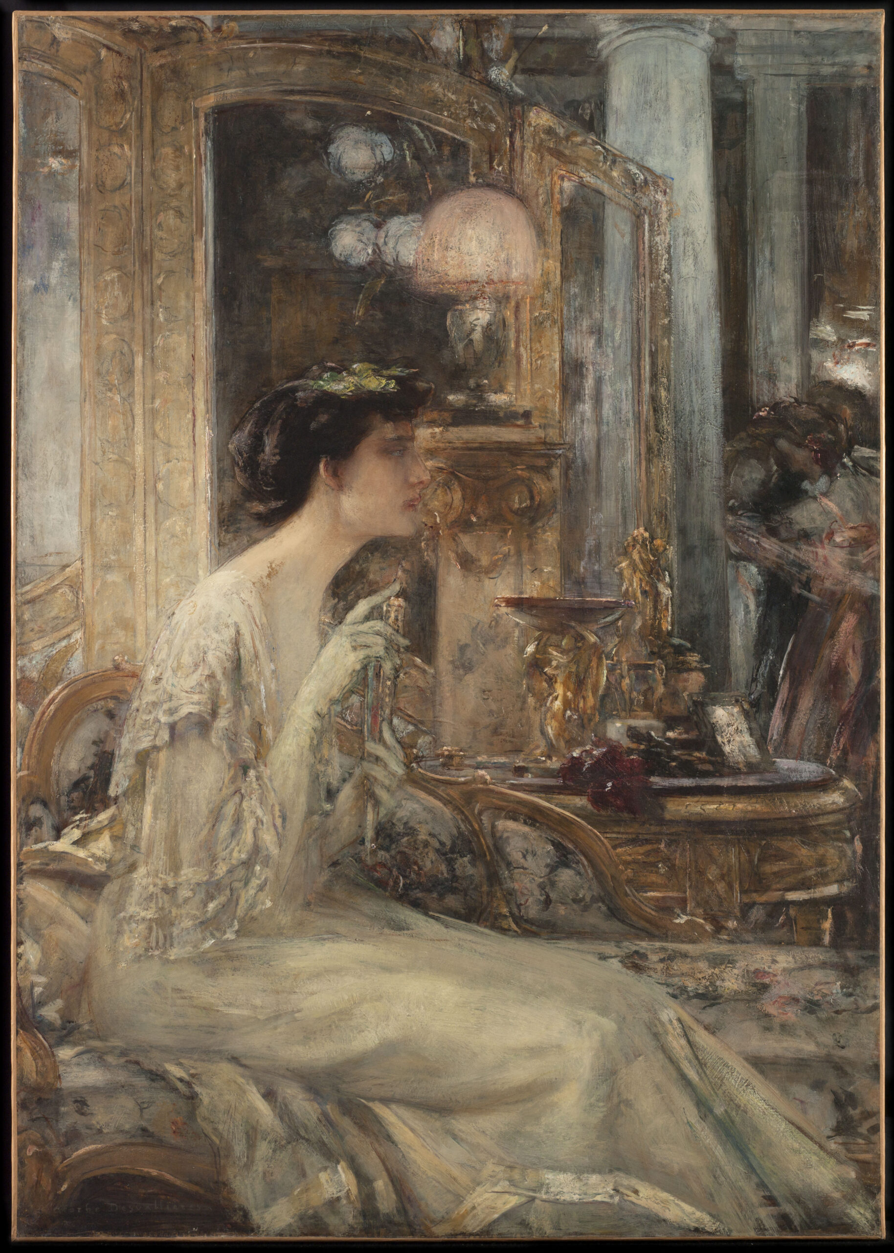 The painter’s vaporous, almost evanescent touch gives the scene a dreamlike dimension, while the precious details—the floral diadem, the art objects arranged on the console—testify to the refinement of this aristocratic world. The artist excels here in the art of atmospheric portraiture, creating a work that transcends mere representation to achieve a truly poetic evocation of Parisian high society.