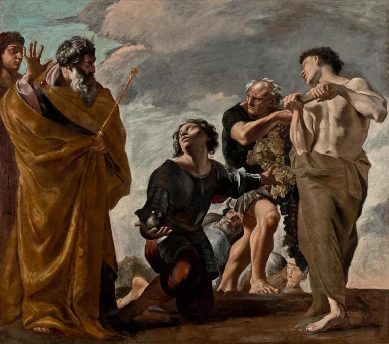 In the Book of Numbers, Moses sends spies to verify the fertility of Canaan. They return laden with grapes, pomegranates, and figs. “It flows with milk and honey,” they announce. For 17th-century Catholic theology, these generous grape clusters prefigure the wine of Communion. Lanfranco translates this biblical parallel into monumental painting for the chapel of Saint Paul Outside the Walls.