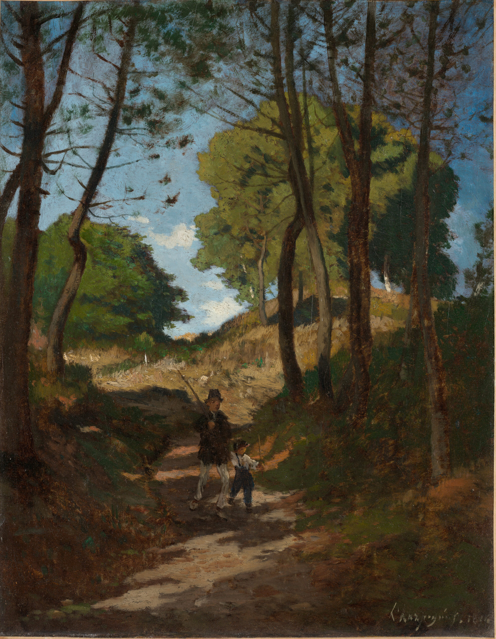 At the heart of this verdant theater, two figures—likely a father and son—walk together, introducing a human narrative dimension to the landscape. The artist masterfully plays with contrasts between the cool shadows of the foreground and the golden light bathing the background, where azure sky glimpses through the foliage. This subtle orchestration of light, characteristic of the Barbizon school, infuses the work with a contemplative atmosphere and suspended temporality.