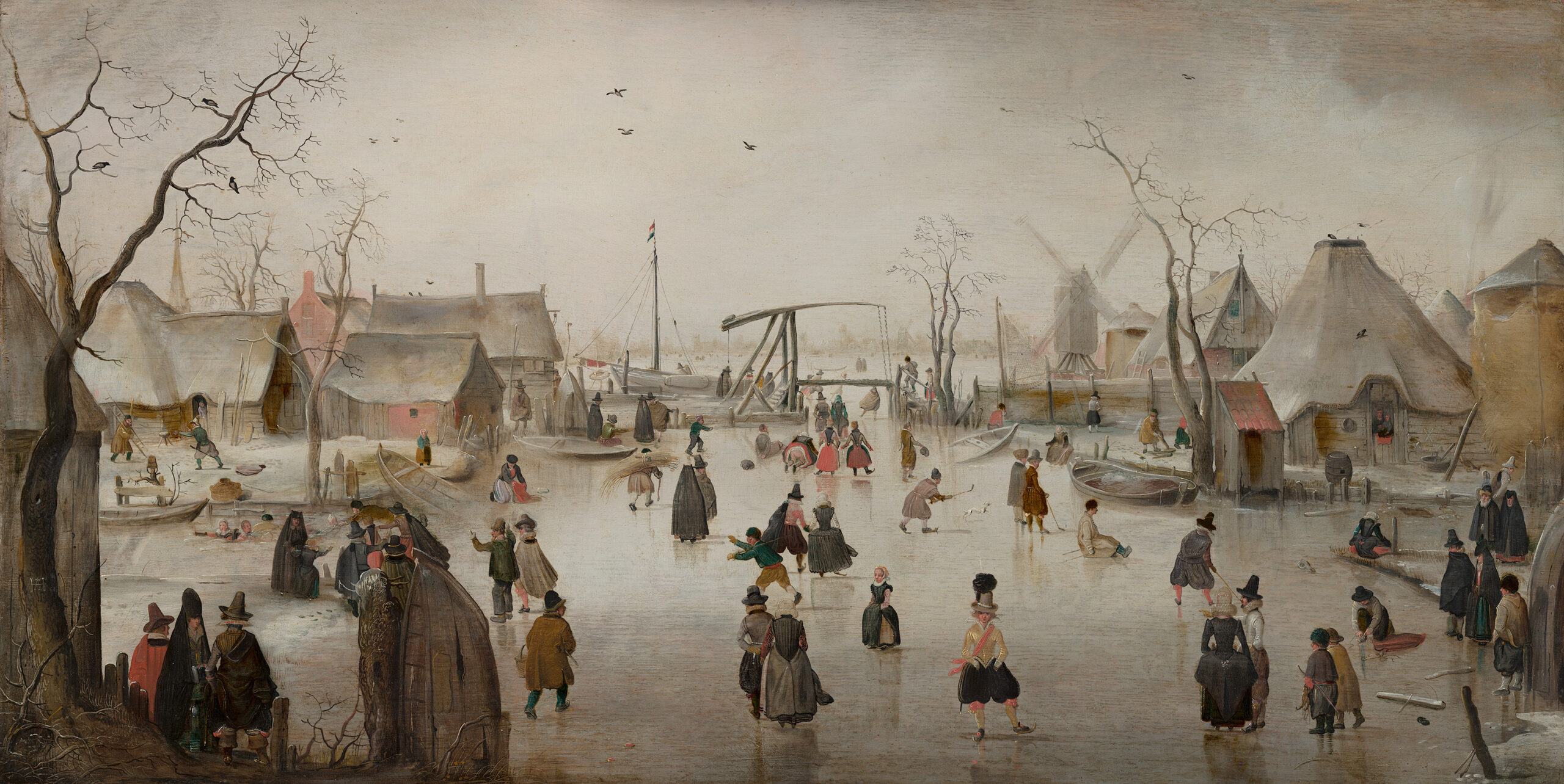 This work emerges during the Little Ice Age that struck northern Europe from 1550 to 1850. Between 1600 and 1700, two-thirds of Dutch winters were extremely harsh. Navigation became impossible, public life paralyzed. Avercamp painted these extreme winters between 1600 and 1625, the period of the most intense cold. This winter landscape tradition has its roots in Pieter Bruegel the Elder and 16th-century Flemish painting.