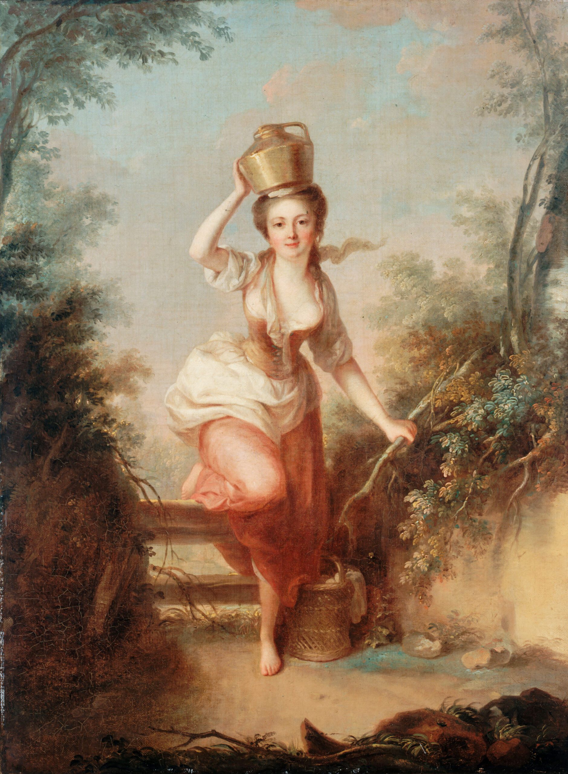 The artist captures with finesse this moment where the young woman, like a rural nymph, moves through a carefully arranged natural setting. The foliage frames the scene, creating an intimate atmosphere, while golden light bathes the whole in an almost mythological aura. This work perfectly embodies the period’s fascination with an idealized rural world, fantasized by the aristocracy, which would reach its pinnacle in Marie-Antoinette’s pastoral entertainments at the Petit Trianon. One can also recognize the influence of La Fontaine’s fables, particularly “The Milkmaid and the Pot of Milk,” conferring upon the canvas a narrative and moral dimension that is subtly suggested.