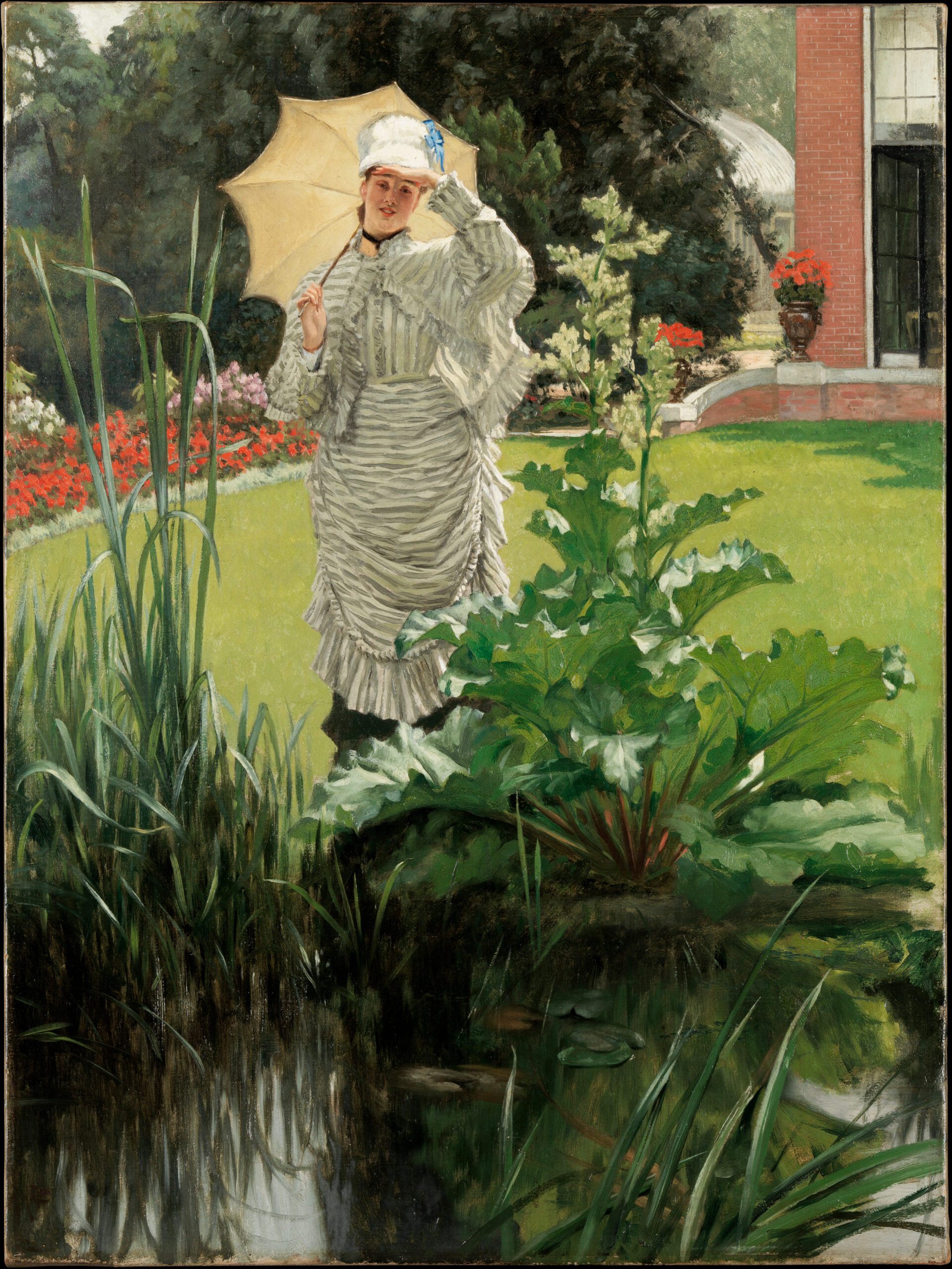 Tissot’s composition emphasizes the subtle interplay between shadow and light. Note how the sunlight delicately penetrates the diaphanous sleeve and parasol, creating a backlit effect typical of the impressionist experiments of this period.