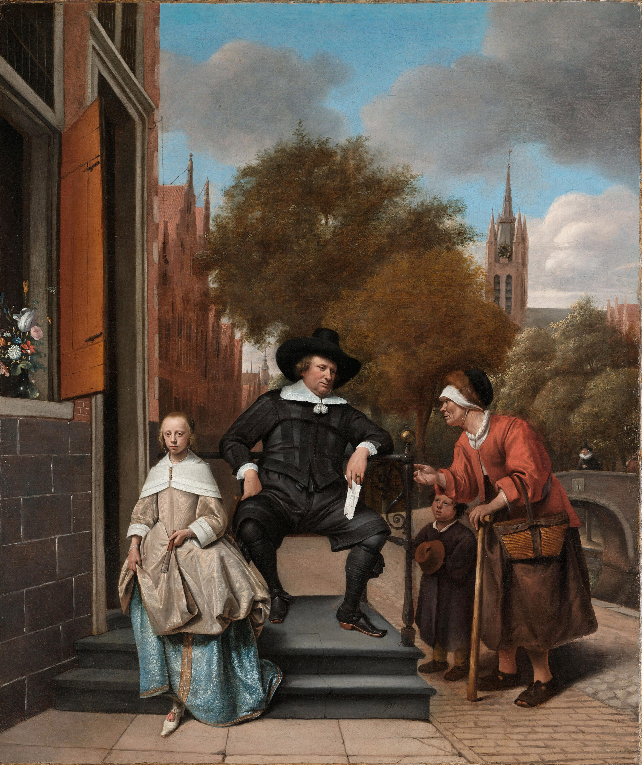 Adolf Croeser, burgomaster and wealthy merchant, sits confidently on the steps of his patrician residence bordering the Oude Delft, in a pose of natural authority. His daughter Catharina, thirteen years old, gazes at the viewer with troubling intensity, embodying the privileged youth of the urban elite. Steen subtly enriches the composition with a moral dimension: an indigent woman accompanied by her child solicits charity from the notable, creating a striking contrast between bourgeois opulence and popular precarity. The refined architecture, recognizable urban landscape, and precision of the costumes testify to Dutch realism, while the golden light unifies this scene with social resonances.