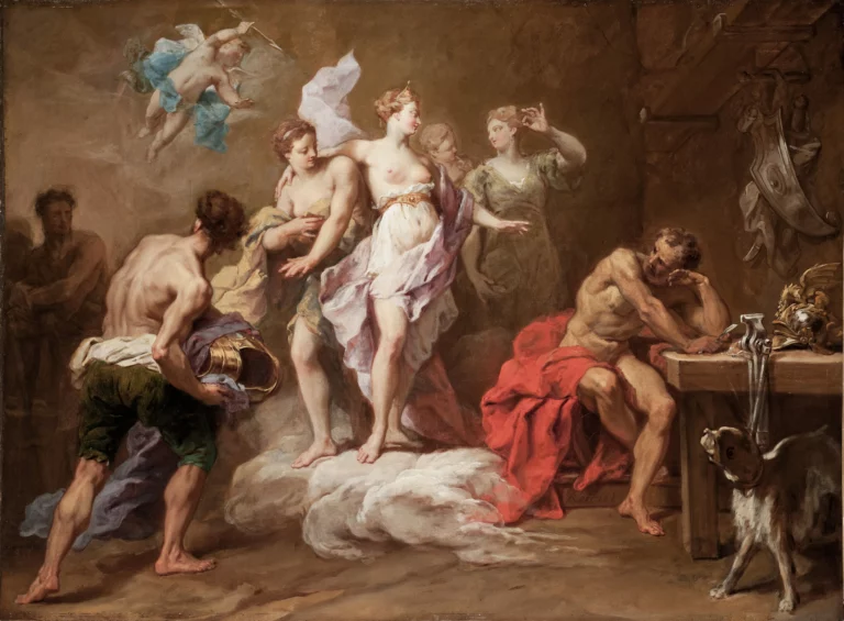 This painting is no ordinary commission. It is the morceau d’agrément — the reception piece — that Restout presented to the Royal Academy, the first step toward his admission as a full member. The subject, drawn from Book VIII of Virgil’s Aeneid, is a staple of the academic repertoire. Venus asks her husband Vulcan to forge divine arms for their son Aeneas. By choosing this scene, Restout demonstrates his command of history painting, the most exalted genre in the academic hierarchy. The gamble paid off. The Academy recognised his talent.