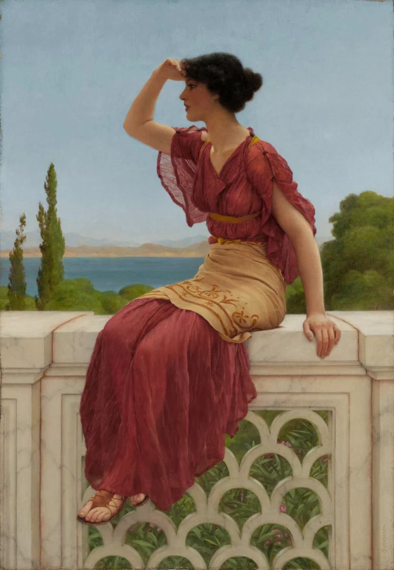 England, 1899. Godward paints a woman alone before the sea. She watches the horizon, hand raised to shield her eyes from the sun. Her suspended gesture says everything: waiting, hope, uncertainty.