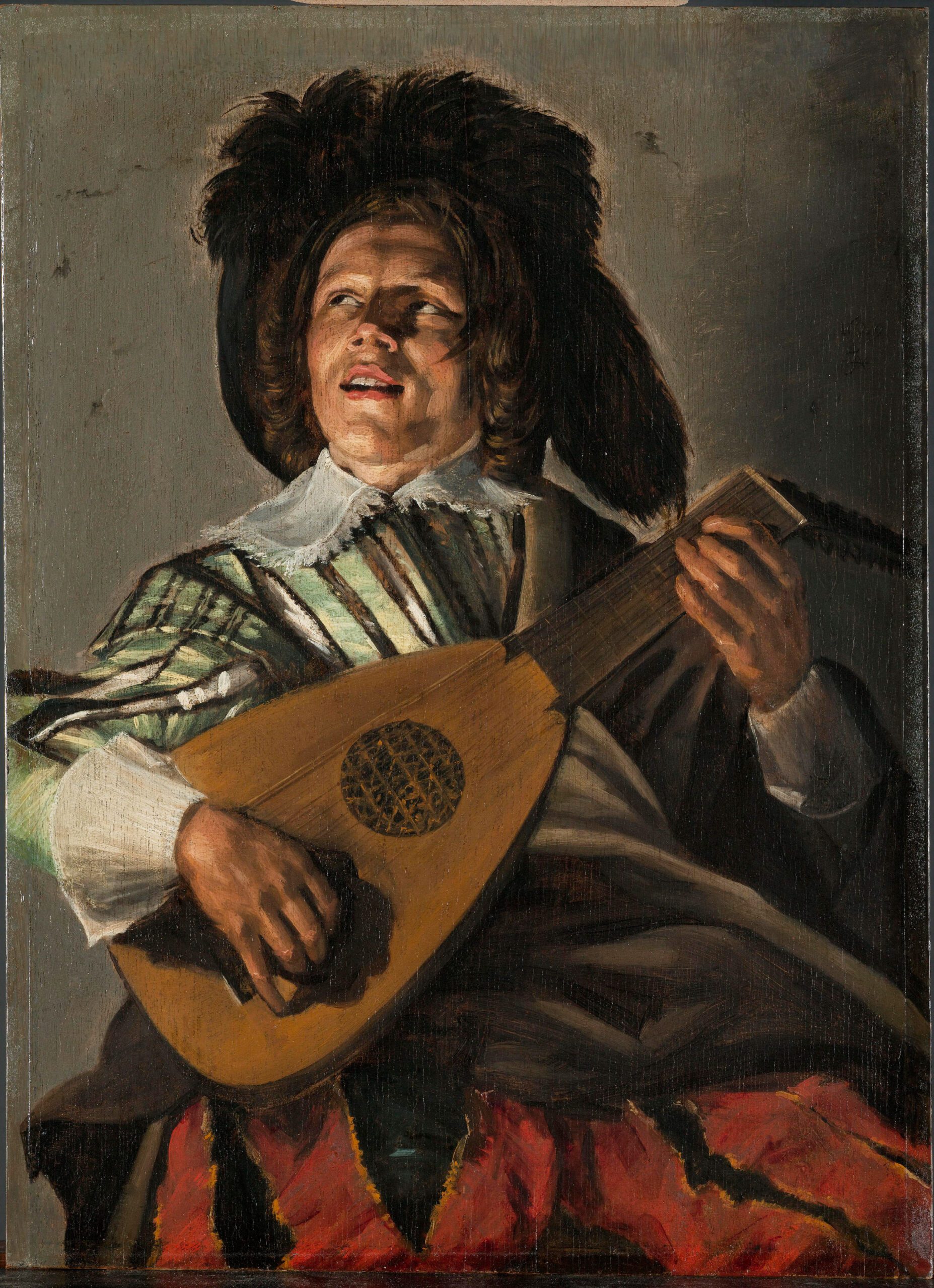 The chiaroscuro sculpts his expressive face as the musician plucks the strings of his lute. His costume—a white shirt with a delicate collar, striped jacket in almond hues, and imposing plumed hat—attests to a theatrical elegance enhanced by the brilliant scarlet breeches that anchor the composition. The artist’s technical virtuosity is revealed in the precise rendering of the instrument, with its finely detailed rosette, and in the capturing of this fleeting moment where music and emotion intertwine. The sober, neutral background focuses our attention on this vibrant character, creating a painting both intimate and universal.