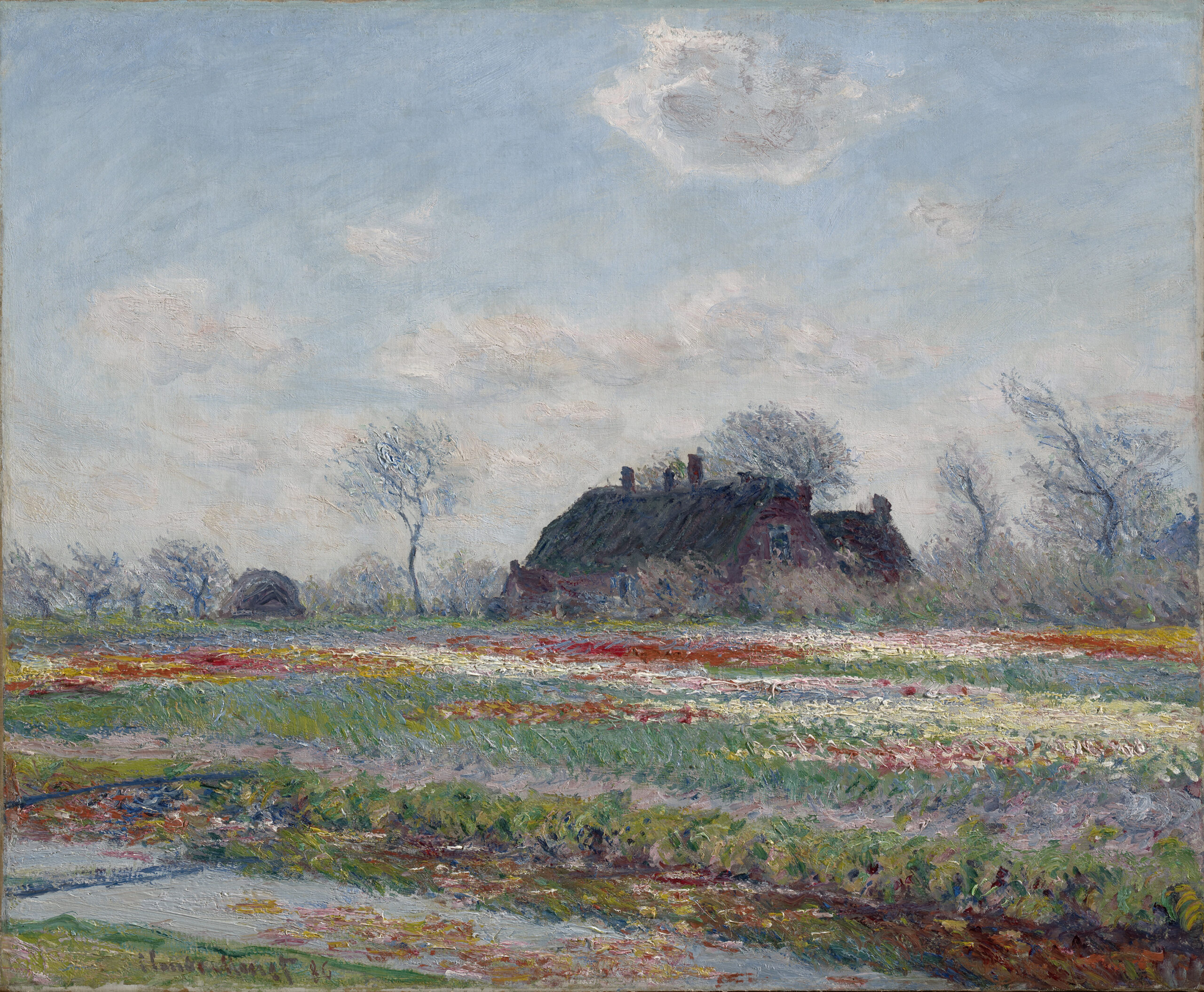 Observe the foreground: bands of vivid red, yellow, violet, and cream stretch across the canvas in parallel brushstrokes. The application is generous; the flowers seem to vibrate under the spring sun. At the center, a Dutch farmhouse anchors the composition while bare trees quiver in a light breeze. The pale blue sky, streaked with white clouds, diffuses a light that is simultaneously soft and cool. Monet constructs the space through successive horizontal strata.