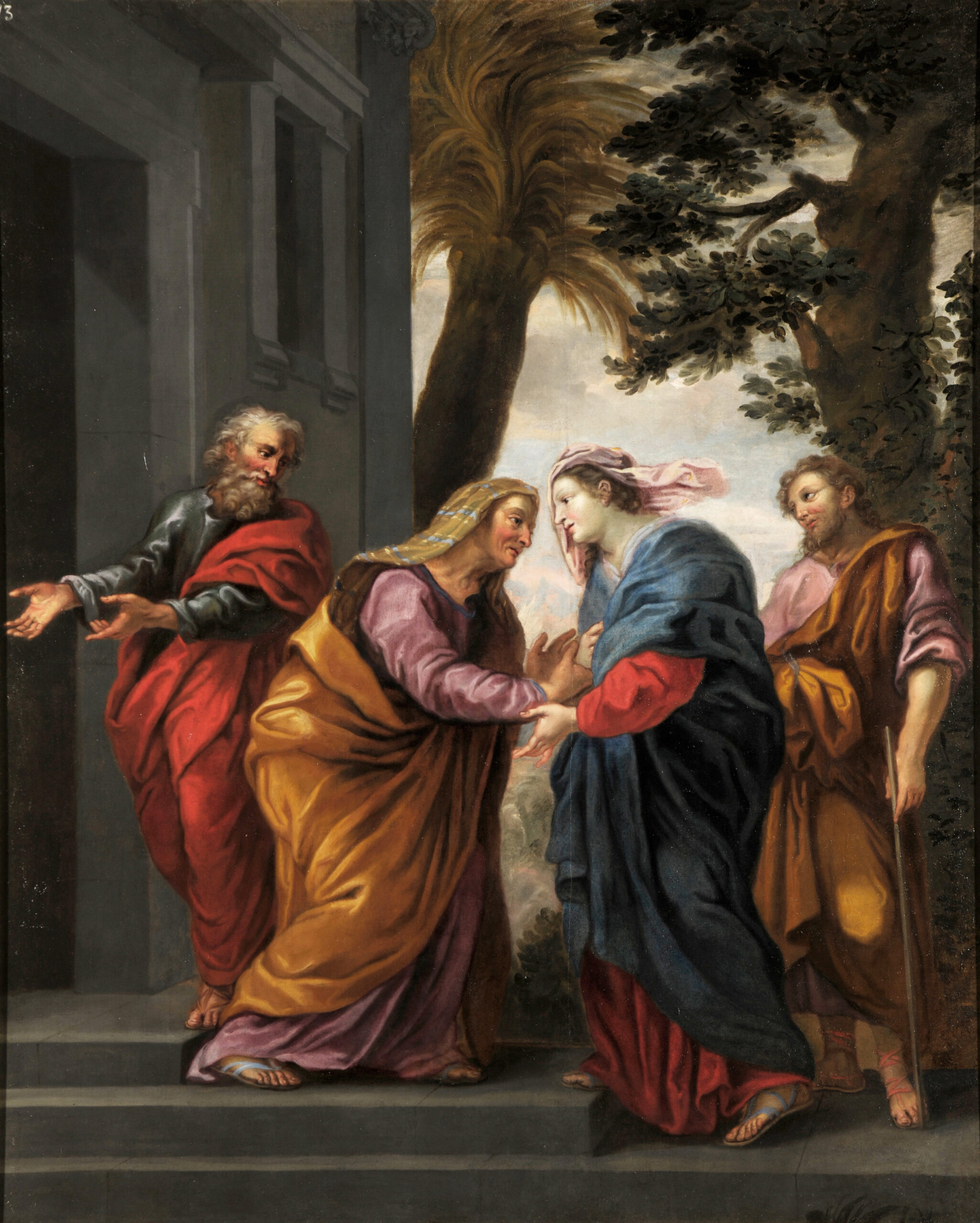 The composition, orchestrated around the encounter between Mary and Elizabeth, displays a baroque theatricality tempered by French classical restraint. At the center stand the two holy women: Mary, recognizable by her blue Marian mantle, and Elizabeth, draped in ochre and purple.