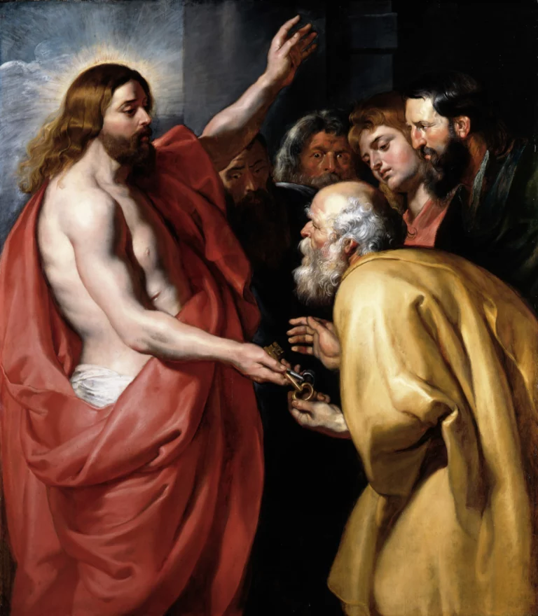 This work symbolizes the institution of the papacy, a cherished theme in Italian art but rare in Flanders. Rubens, then a sought-after painter throughout Europe, worked for ecclesiastical and princely patrons. His style absorbed Italian influences, notably Caravaggio’s humanist conception. This composition would serve as a model for numerous artists through an engraving by Pieter de Jode I.