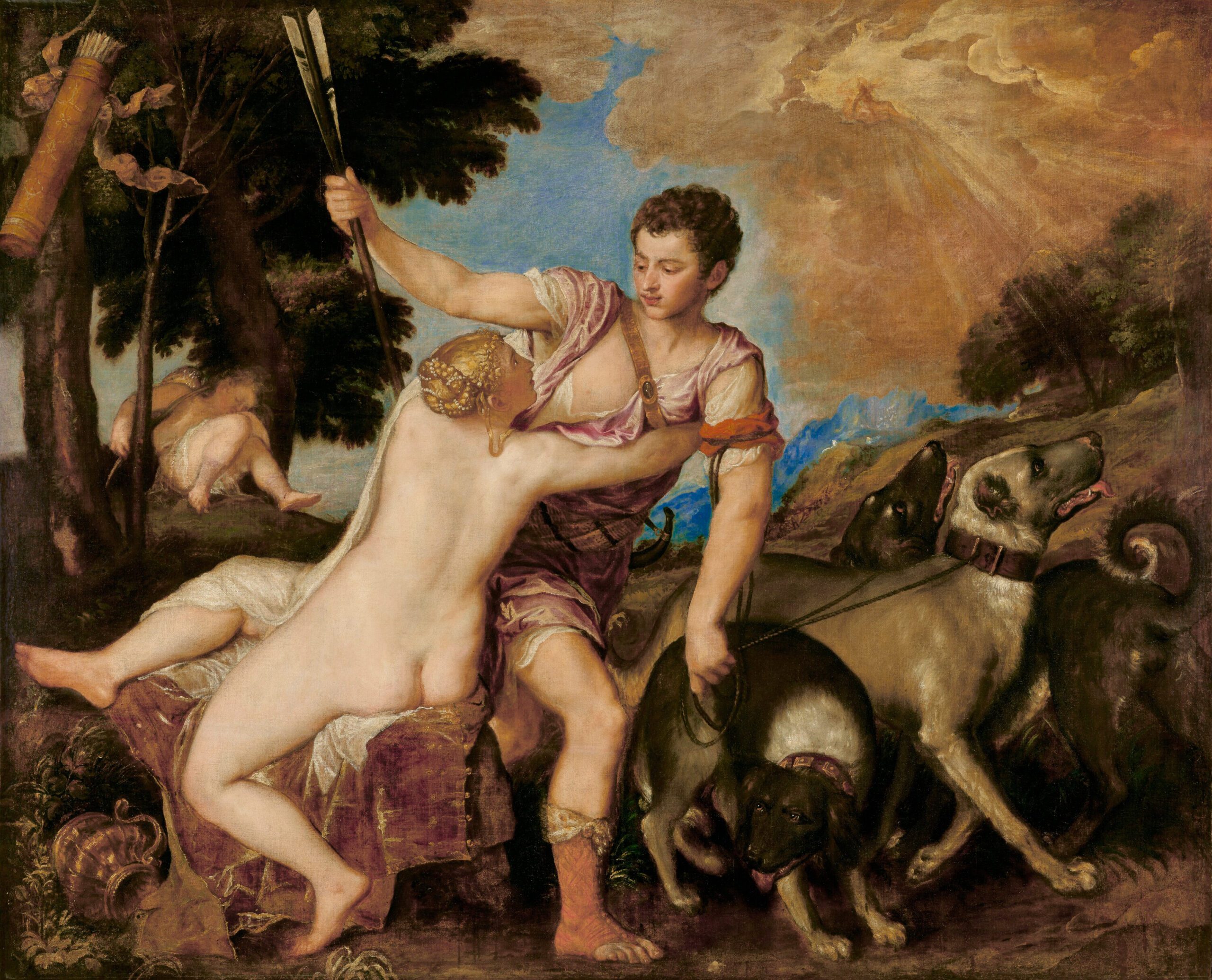 We witness a moment of extreme tension: Venus, goddess of love, desperately clings to her lover Adonis who is preparing to leave for the fateful hunt. The resplendent nudity of Venus, seen from behind in a bold twist, contrasts with Adonis’ determination, dressed for hunting and firmly holding his spears. The impatient mastiffs pull on their leashes, foreshadowing the tragic fate awaiting the young man.