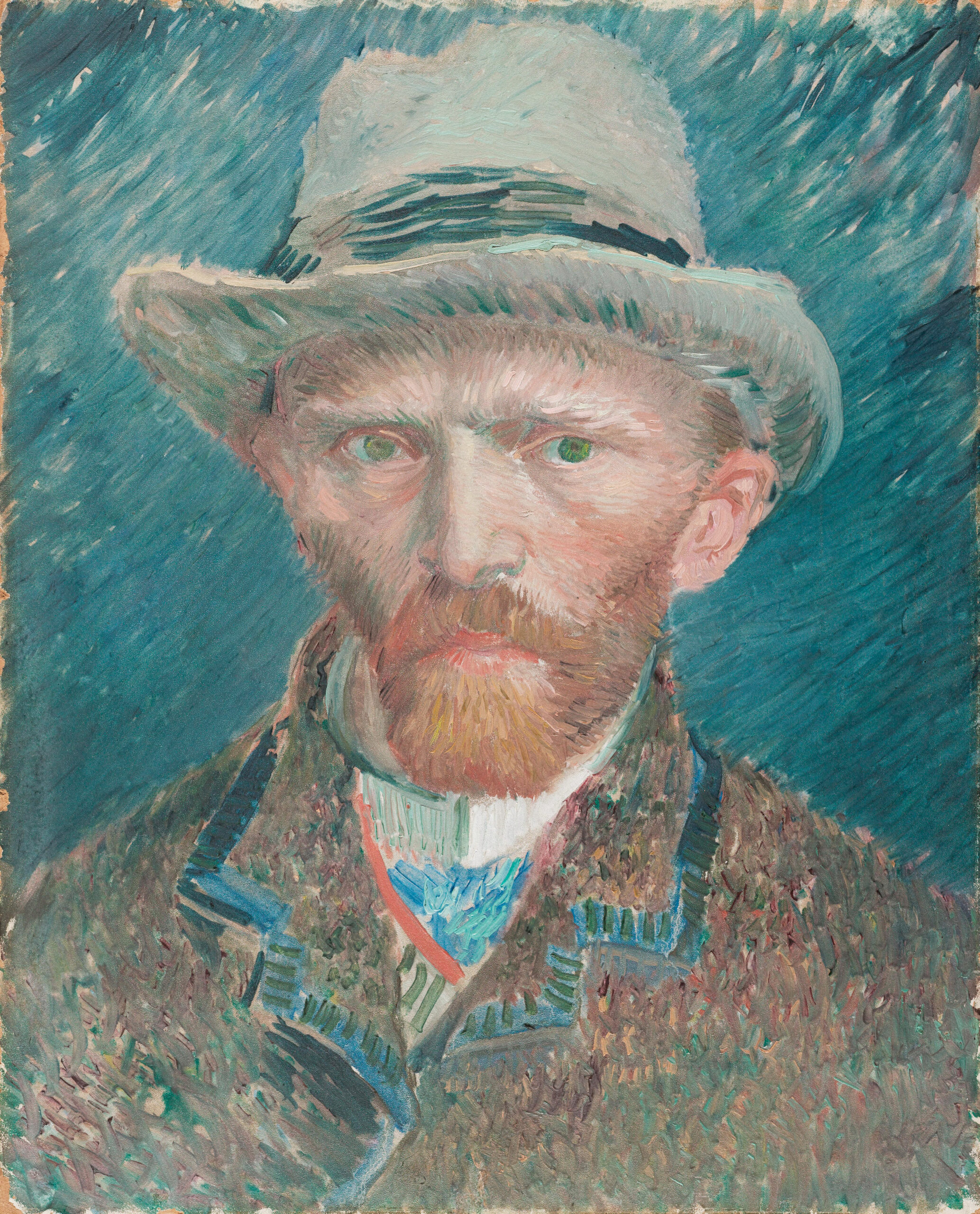 The penetrating gaze of the artist, highlighted by piercing green eyes, confronts the viewer with remarkable intensity. Van Gogh presents himself dressed in a thick brown coat and wide-brimmed gray hat.