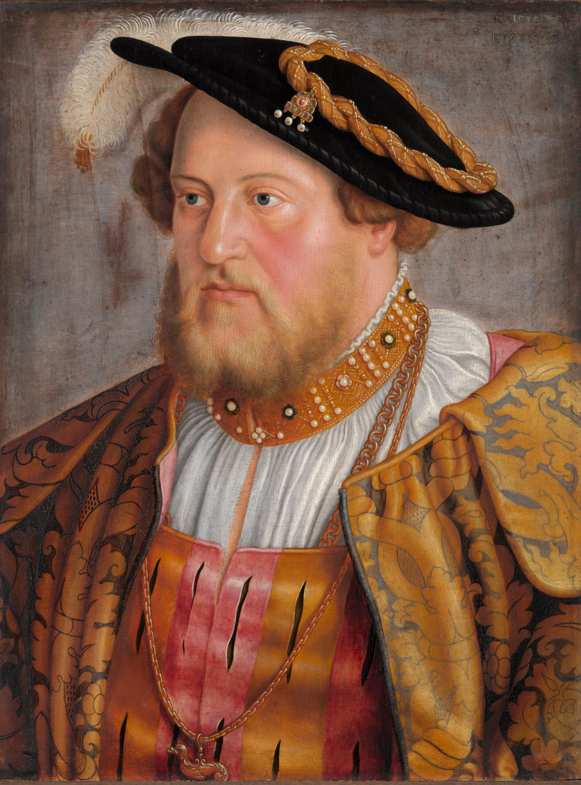 L’œuvre révèle l’influence de la Renaissance italienne adaptée au goût germanique pour le détail. Le personnage, représenté en buste selon les canons du portrait officiel, arbore les insignes de sa haute noblesse : le chapeau orné de plumes d’autruche et de passementeries dorées, le col richement brodé de perles, et le pourpoint aux crevés rouges rehaussés d’or. La technique picturale de Beham se distingue par un modelé subtil des chairs et un rendu minutieux des textures, héritages de l’école danubienne. Les tons chauds – ocres, rouges et ors – contrastent avec le fond neutre, concentrant l’attention sur la prestance du modèle. Cette commande illustre parfaitement l’art de cour dans l’Empire germanique, où le portrait devient instrument de représentation politique et sociale, affirmant le rang et la magnificence du commanditaire.