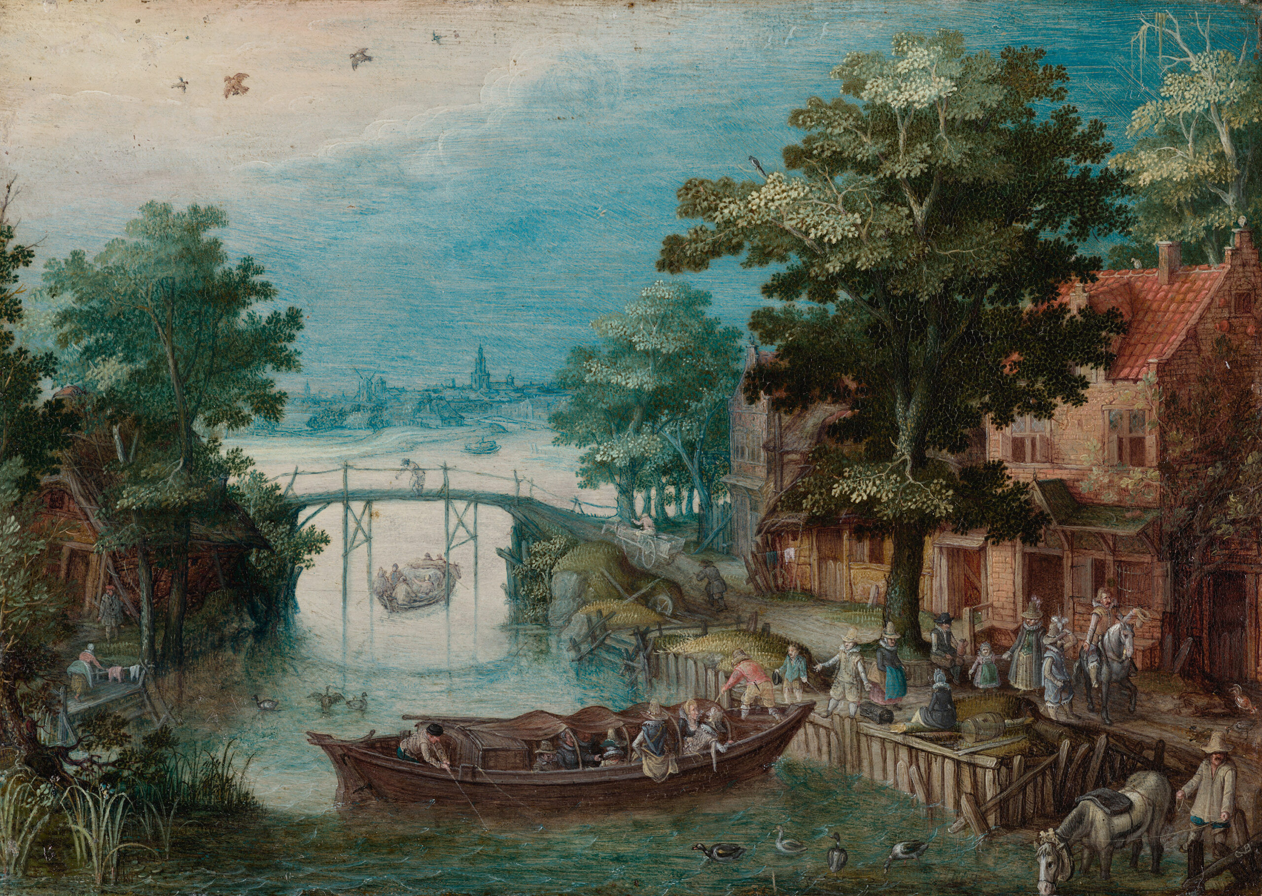 Christoffel Van den Berghe déploie ici une vision idyllique de la vie rurale estivale, caractérisée par une minutie descriptive héritée de la tradition nordique. La composition s’organise autour d’un village fluvial où l’activité humaine s’harmonise parfaitement avec le cycle naturel. Au premier plan, une barque chargée de passagers évoque la navigation estivale, tandis qu’un embarcadère animé de figures en costumes colorés illustre les activités villageoises. L’architecture vernaculaire, aux toitures de tuiles et aux façades ocre, ancre la scène dans la réalité flamande. La luxuriance estivale contraste avec le pendant hivernal de cette série saisonnière. Van den Berghe maîtrise parfaitement l’art de la perspective atmosphérique, guidant le regard vers la ville lointaine par un jeu subtil de plans successifs. Cette esthétique du quotidien séduisait la bourgeoisie, avide de ces évocations harmonieuses.