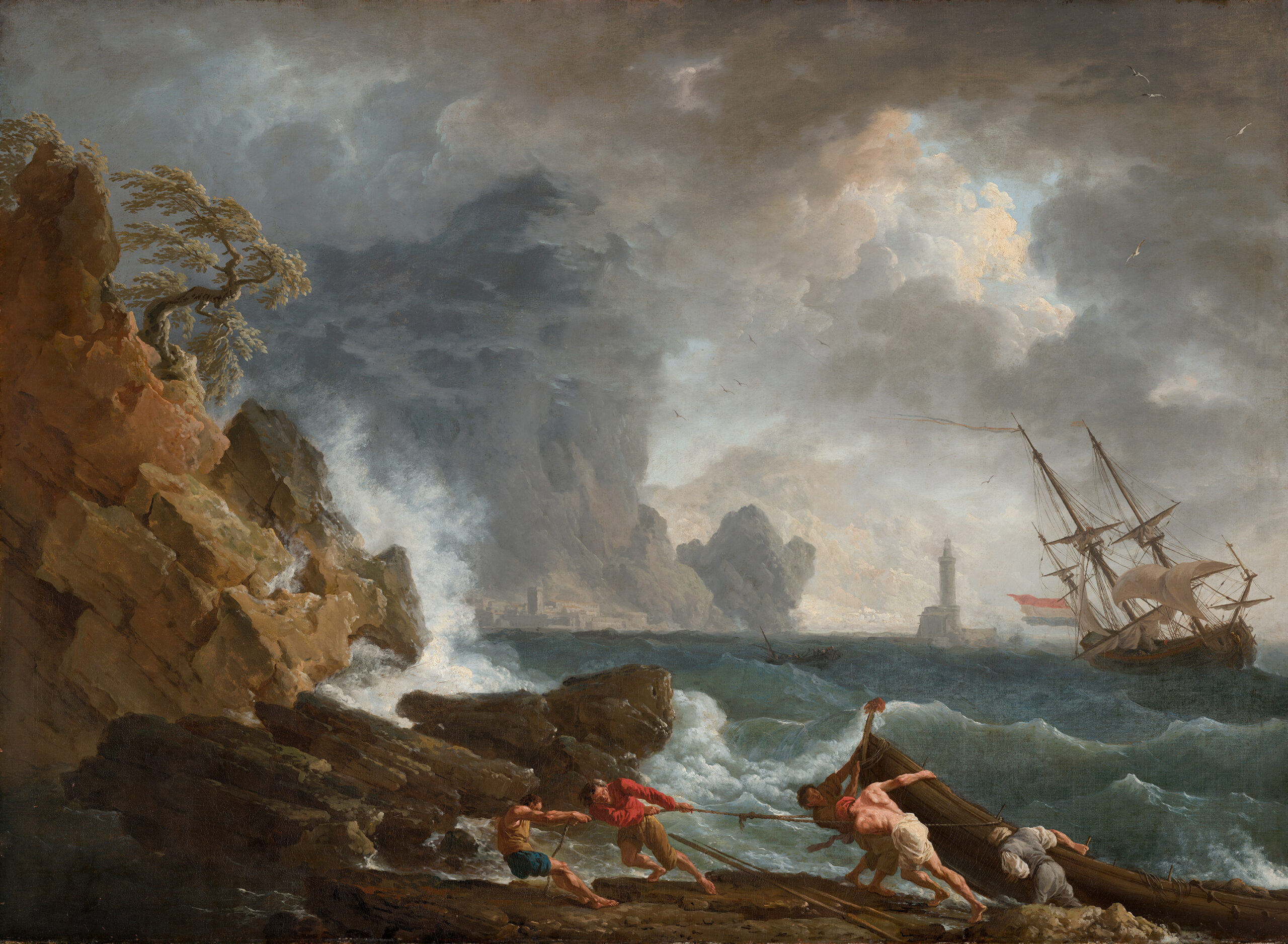 Cette œuvre montre la fascination du peintre pour les phénomènes atmosphériques et leur impact sur l’activité humaine. La composition révèle un sens aigu de la théâtralité : au premier plan, des marins luttent désespérément contre les éléments déchaînés, tirant une embarcation vers la sécurité de la côte rocheuse. Le contraste saisissant entre la fragilité humaine et la puissance de la tempête constitue le ressort dramatique de l’œuvre. Vernet déploie ici sa palette chromatique caractéristique, opposant les ocres dorés des falaises aux verts profonds de la mer houleuse, tandis que le ciel plombé amplifie l’effet pathétique. Au loin, un navire malmené par les éléments et les silhouettes d’un port méditerranéen ancrent la scène dans cette Italie mythique qui nourrit l’imaginaire du peintre. Cette toile, issue de collections prestigieuses, témoigne de la renommée de l’artiste.