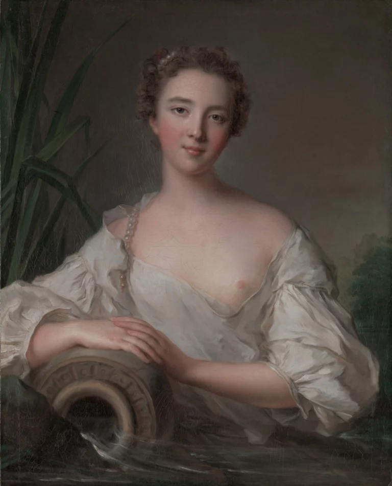 Au 18e siècle, la mythologie offre aux peintres une liberté précieuse. Représenter une femme en nymphe ou en source antique permet d’allier sensualité et culture classique. Nattier excelle dans cet exercice. L’identité du modèle reste mystérieuse : longtemps attribuée à Louise Henriette de Bourbon-Conti, cette attribution est aujourd’hui contestée. La touche libre, la composition séduisante suggèrent une œuvre destinée au marché privé — peinte pour plaire, pour circuler, pour séduire un amateur éclairé.