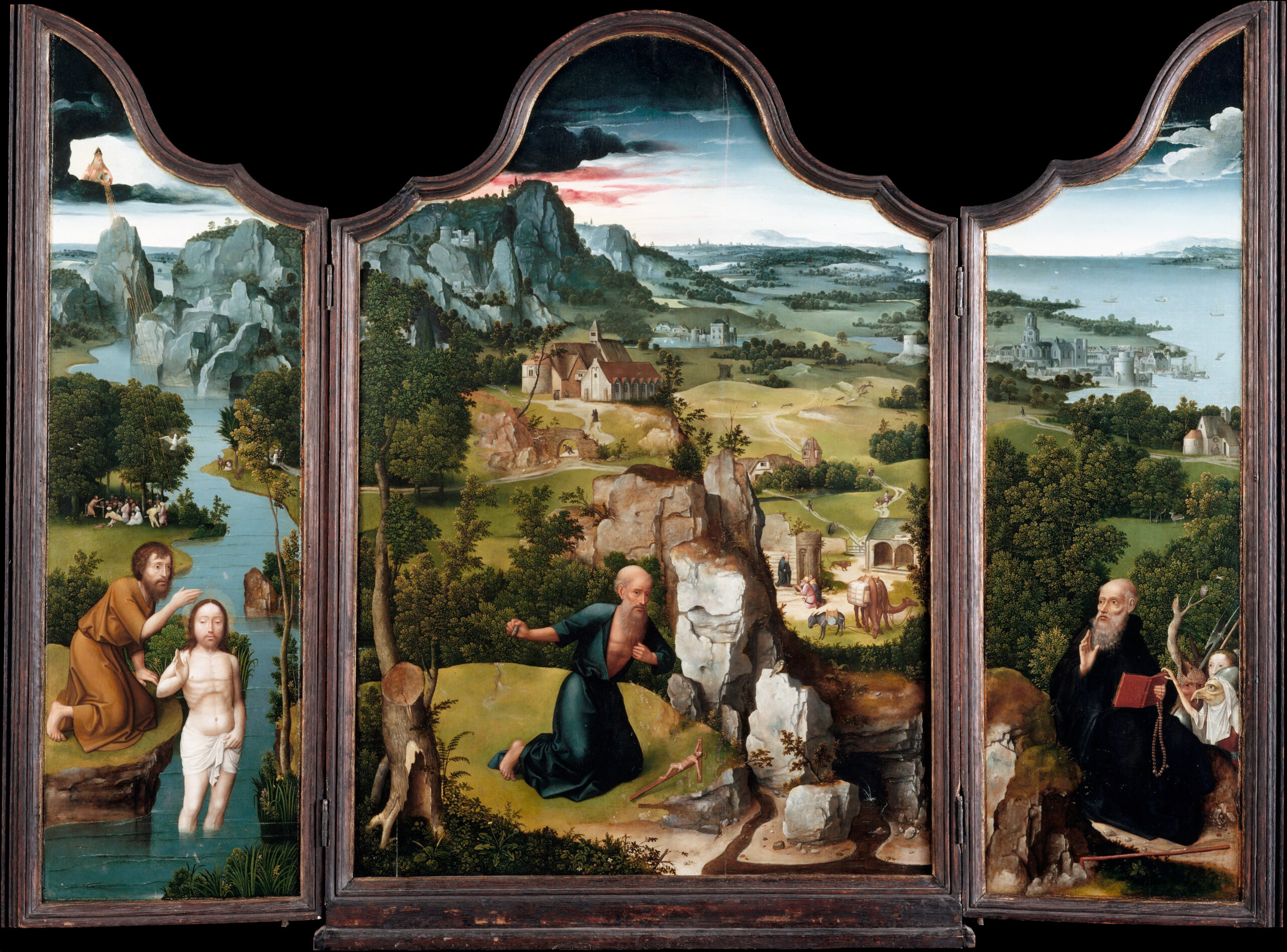 Patinir déploie ici sa virtuosité dans l’art du paysage, créant une véritable « mappemonde spirituelle » où les scènes sacrées s’inscrivent dans une immensité naturelle. Les trois panneaux nous offrent un véritable voyage contemplatif : à gauche, le baptême du Christ dans les eaux cristallines du Jourdain ; au centre, saint Jérôme en pénitence devant une grotte ; à droite, saint Antoine tourmenté par des créatures fantastiques. La palette caractéristique de Patinir, avec ses bleus profonds et ses verts émeraude, confère à l’ensemble une dimension cosmique saisissante. L’artiste révolutionne ici la hiérarchie traditionnelle en miniaturisant les figures saintes au profit d’un paysage panoramique vertigineux qui invite le regard à une véritable pérégrination méditative.