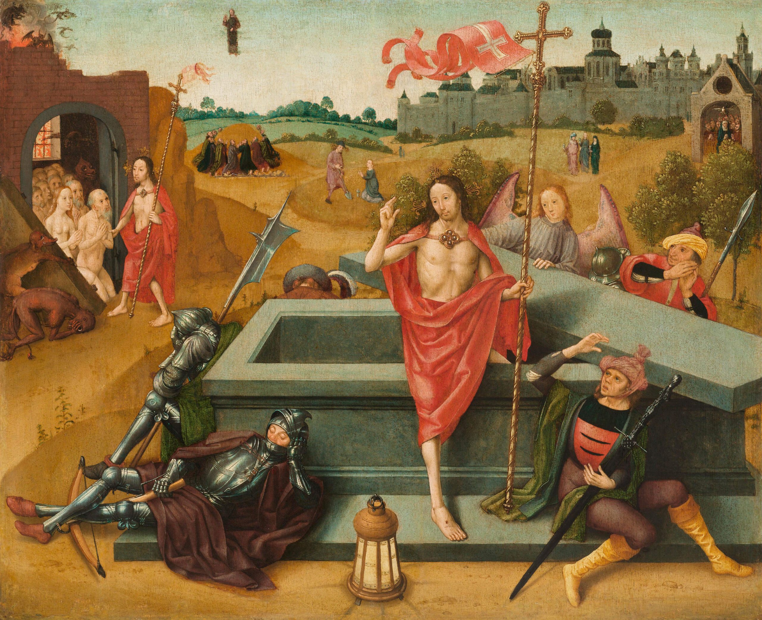Le Christ émerge majestueusement du tombeau, son corps lumineux drapé d’un manteau écarlate flottant qui contraste avec la pierre froide du sépulcre. Sa main droite levée en bénédiction et la croix processionnelle qu’il tient affirment sa victoire sur la mort. L’artiste déploie une remarquable maîtrise narrative en intégrant simultanément plusieurs épisodes du cycle pascal en arrière-plan : le Christ aux Limbes libérant les âmes des justes, son Ascension vers les cieux, la scène du « Noli me tangere » avec Marie-Madeleine, les saintes femmes en pèlerinage vers le tombeau, et la Pentecôte représentée par l’église illuminée.