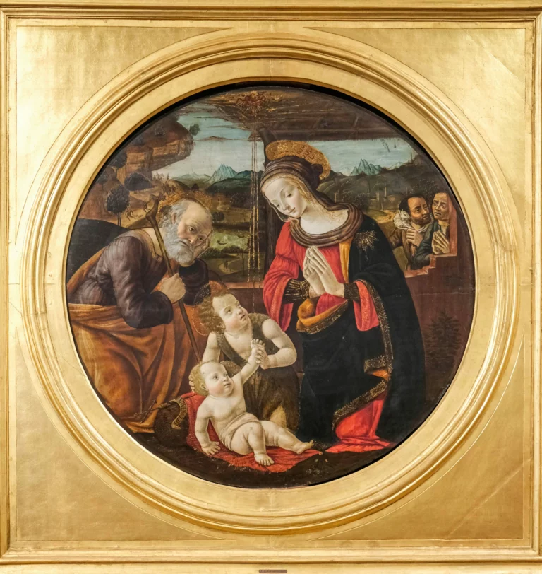 La tempera sur panneau révèle sa délicatesse dans chaque coup de pinceau. Le format circulaire, appelé tondo, concentre tous les regards vers l’Enfant Jésus au centre. La Vierge en robe rouge et or se penche avec une tendresse infinie. Saint Joseph, au visage marqué, tient son bâton avec dignité. Le petit saint Jean-Baptiste, debout, tient le Christ en adoration. Deux bergers apparaissent à droite : l’un porte un agneau sur ses épaules. Au-delà de la hutte rudimentaire, un paysage montagneux foisonnant s’étend, peuplé de minuscules personnages. Les traits nordiques de Joseph contrastent avec la douceur florentine de Marie.