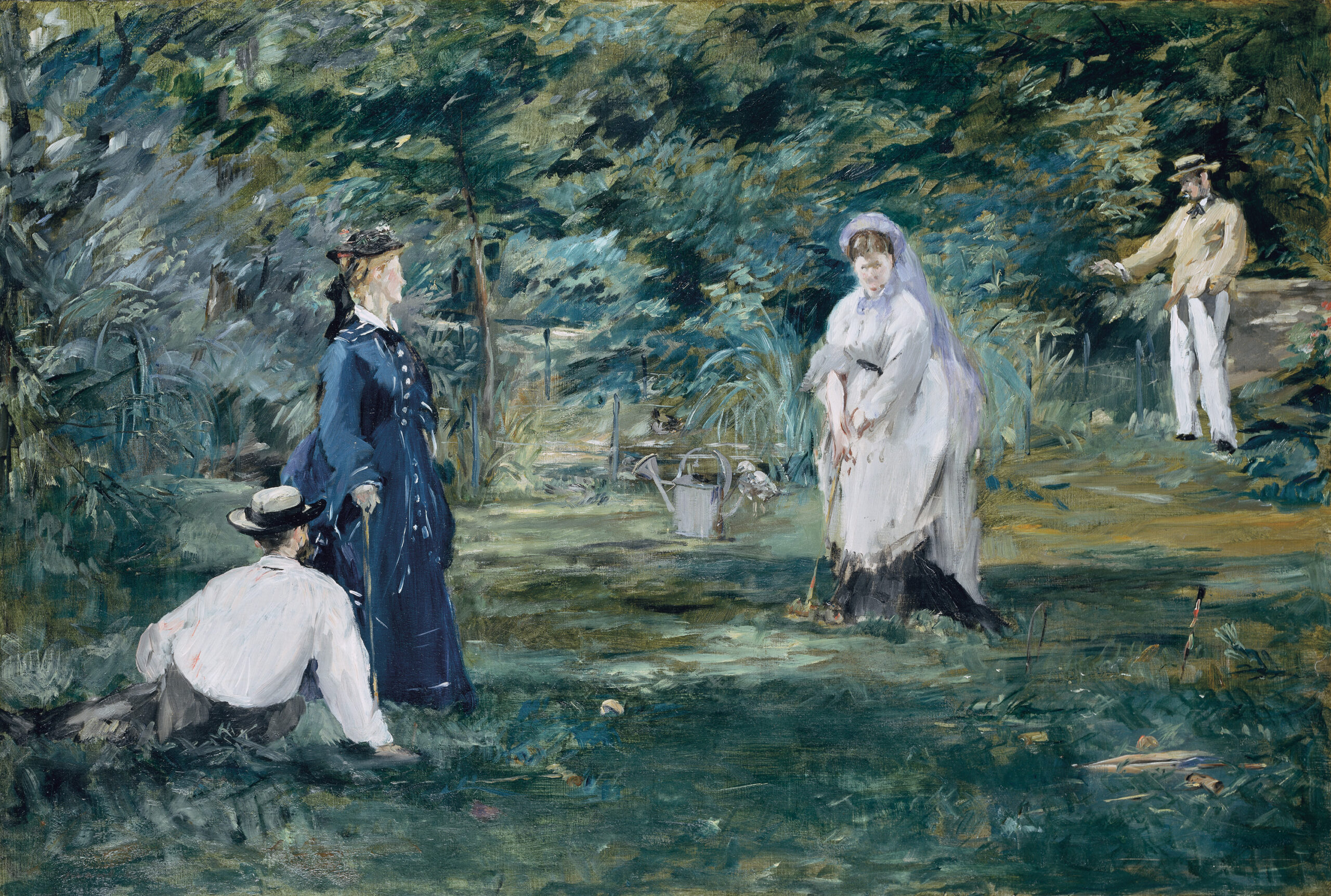 Cette scène de loisir bourgeois cache une provocation subtile. L’ami peintre Alfred Stevens pose au premier plan. Paul Roudier figure à l’arrière. Les deux femmes ne sont pas leurs épouses, mais des modèles d’atelier. Manet met en scène une fausse respectabilité. Le croquet, passe-temps à la mode dans les jardins, sert de décor à cette comédie sociale. Rarement Manet s’est autant rapproché du style impressionniste. Pourtant la composition reste calculée. Chaque personnage occupe une place précise. La spontanéité apparente dissimule une construction rigoureuse.