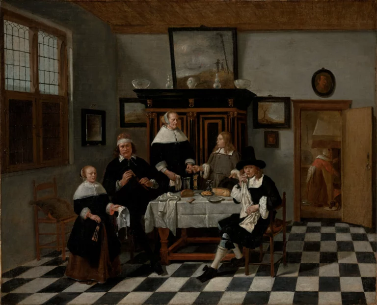 Regardez cette scène avec attention. Le sol en damier noir et blanc structure l’espace. La nappe blanche illumine le centre de la composition. Autour de la table, cinq figures s’organisent. La petite fille tient sa coiffe amidonnée et son éventail. Le père, assis, observe d’un œil pensif. Van Brekelenkam maîtrise la touche hollandaise : lumière diffuse, matières rendues avec précision, palette sobre dominée par les noirs, blancs et bruns chauds. Chaque détail compte — le pain, la carafe, les objets posés sur le buffet.