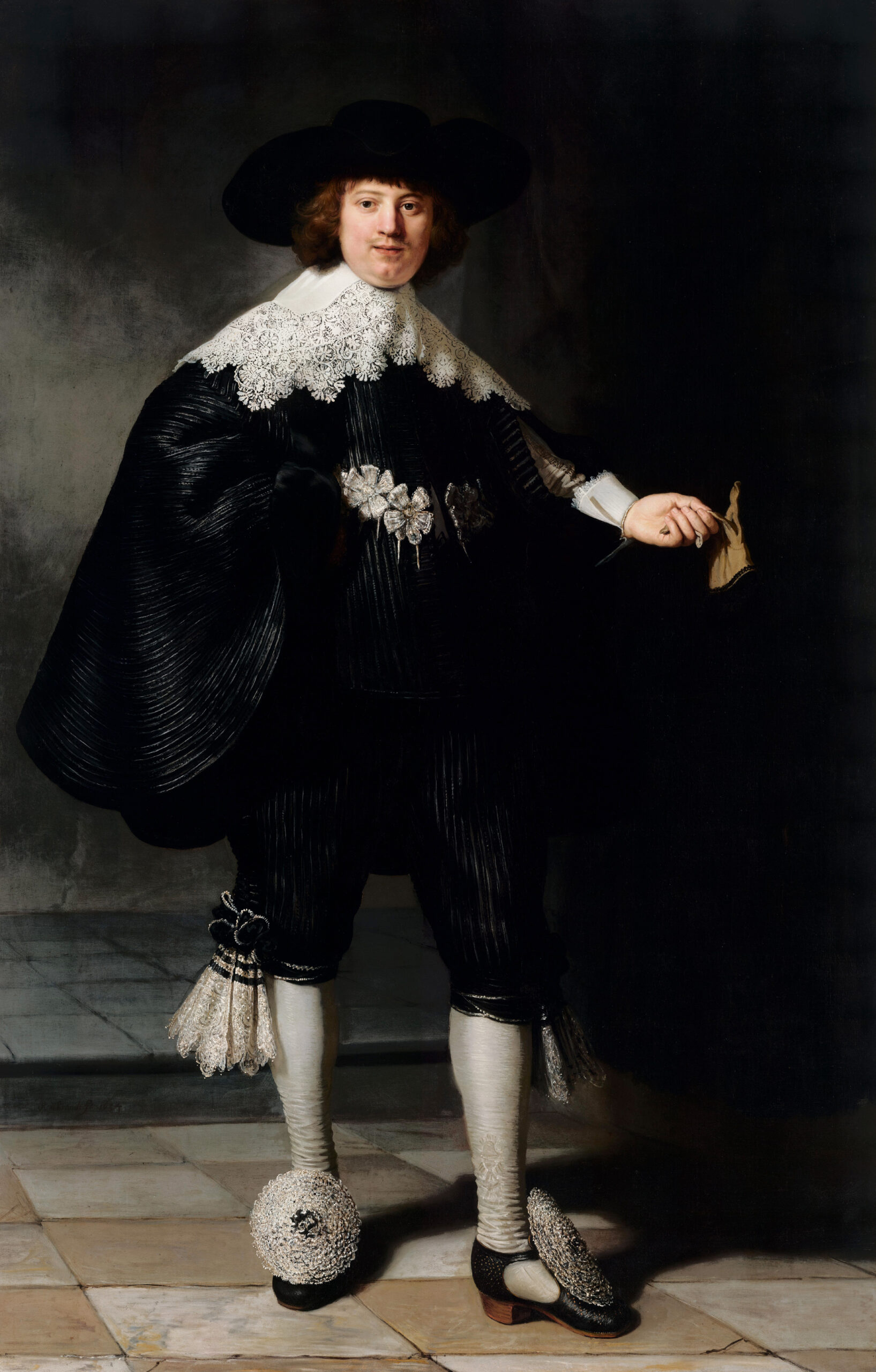 La maîtrise du clair-obscur atteint ici des sommets : la lumière, savamment orchestrée, fait étinceler la somptueuse dentelle flamande du col et des manchettes, véritables prouesses techniques. Le costume noir, d’une élégance raffinée, rehaussé de rosettes et de rubans, témoigne d’une opulence assumée dans une société calviniste pourtant réputée austère. Ce gant tenu avec nonchalance révèlent un caractère affirmé, conscient de son rang.